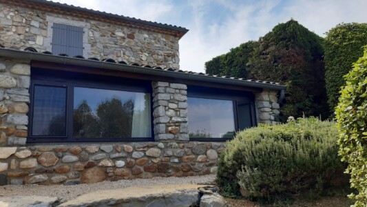 Dans la basse Ardèche aux airs de Provence, nos menuiseries extérieures en aluminum se marient avec la pierre locale. Tandis que, pour les menuiseries intérieures et l'agencement, le chêne ramène une touche chaleureuse à travers les espaces.